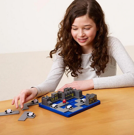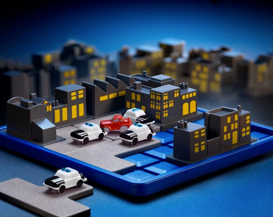 Votre mission : trouver la position des 6 pièces de puzzle qui permettra de bloquer la voiture rouge (le voleur) ET de ne laisser aucune case vide sur le plateau.