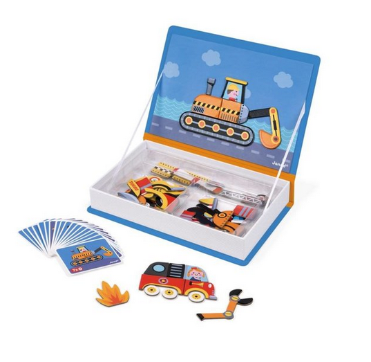 Ce jeu éducatif magnétique en carton sur le thème des bolides comprend 50 pièces magnétiques et 18 cartes modèles (camion de pompier, sous-marin, tank, bateau, grue, avion…)